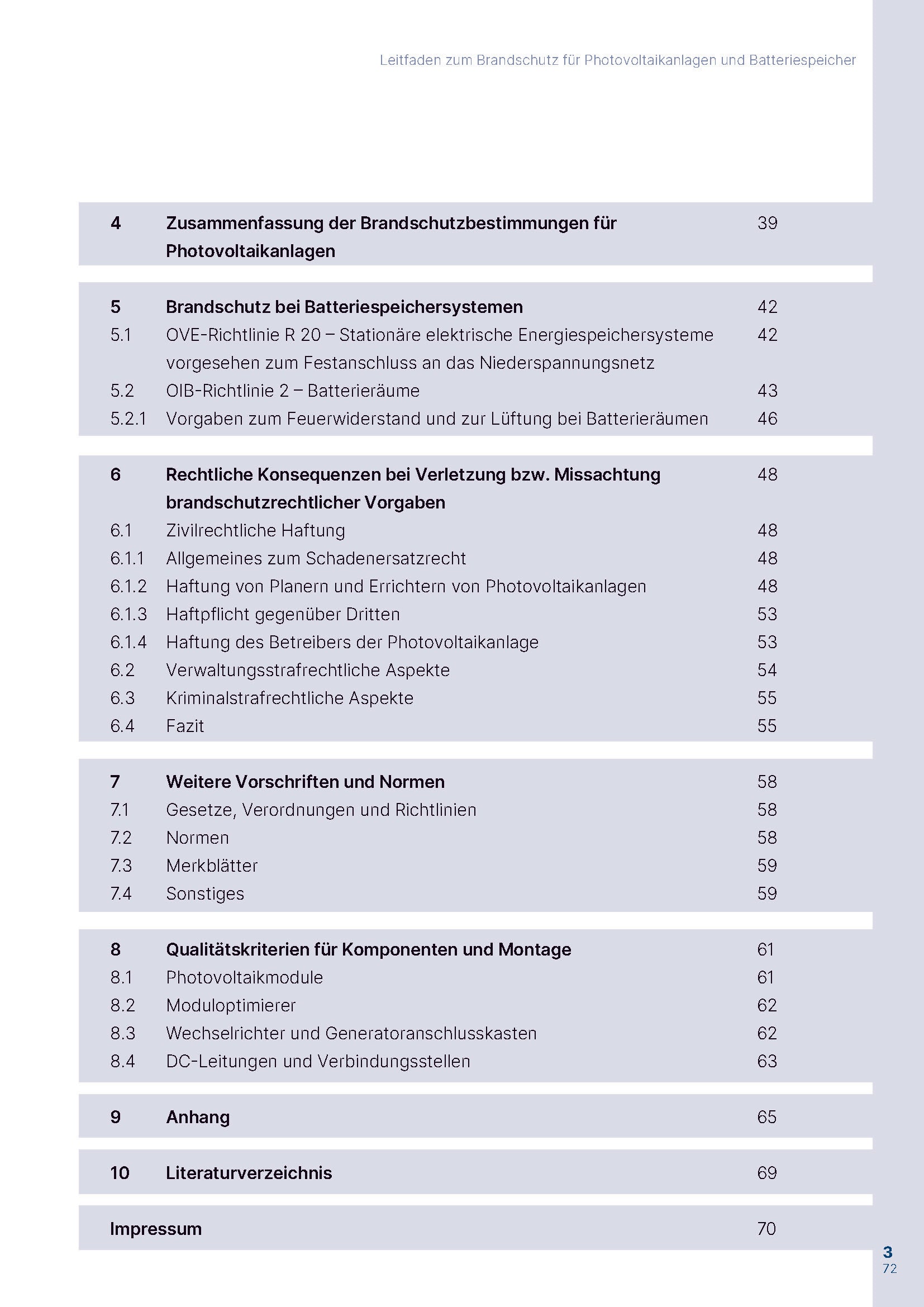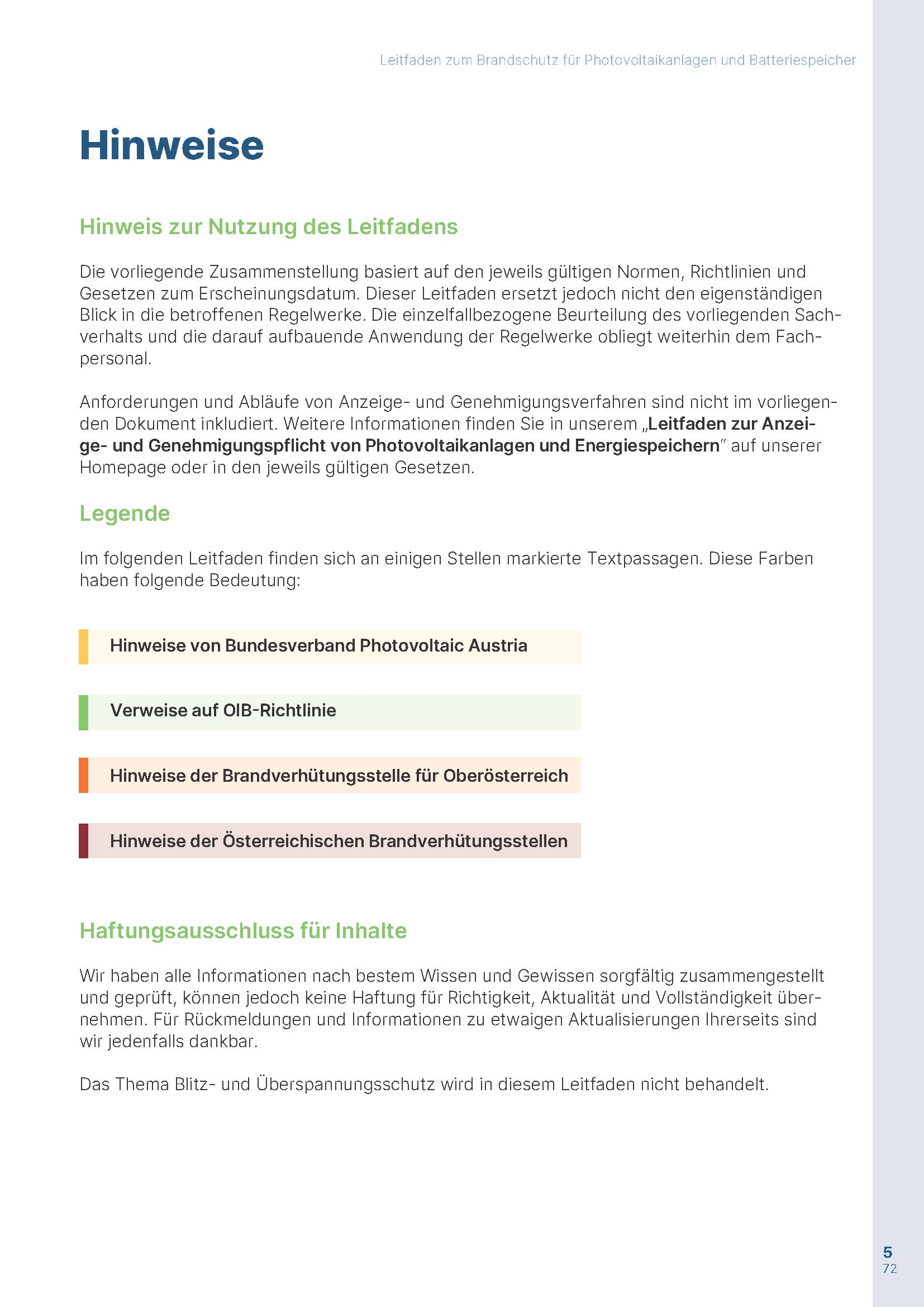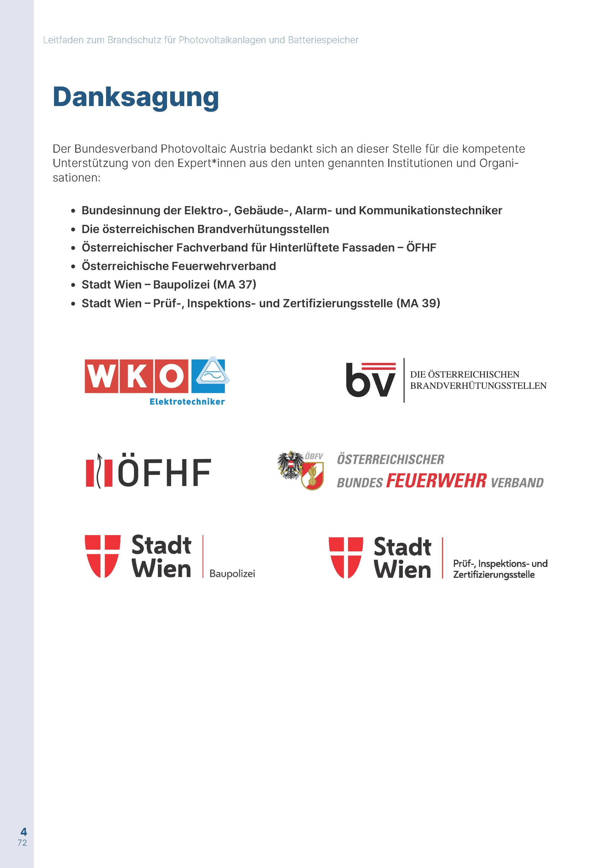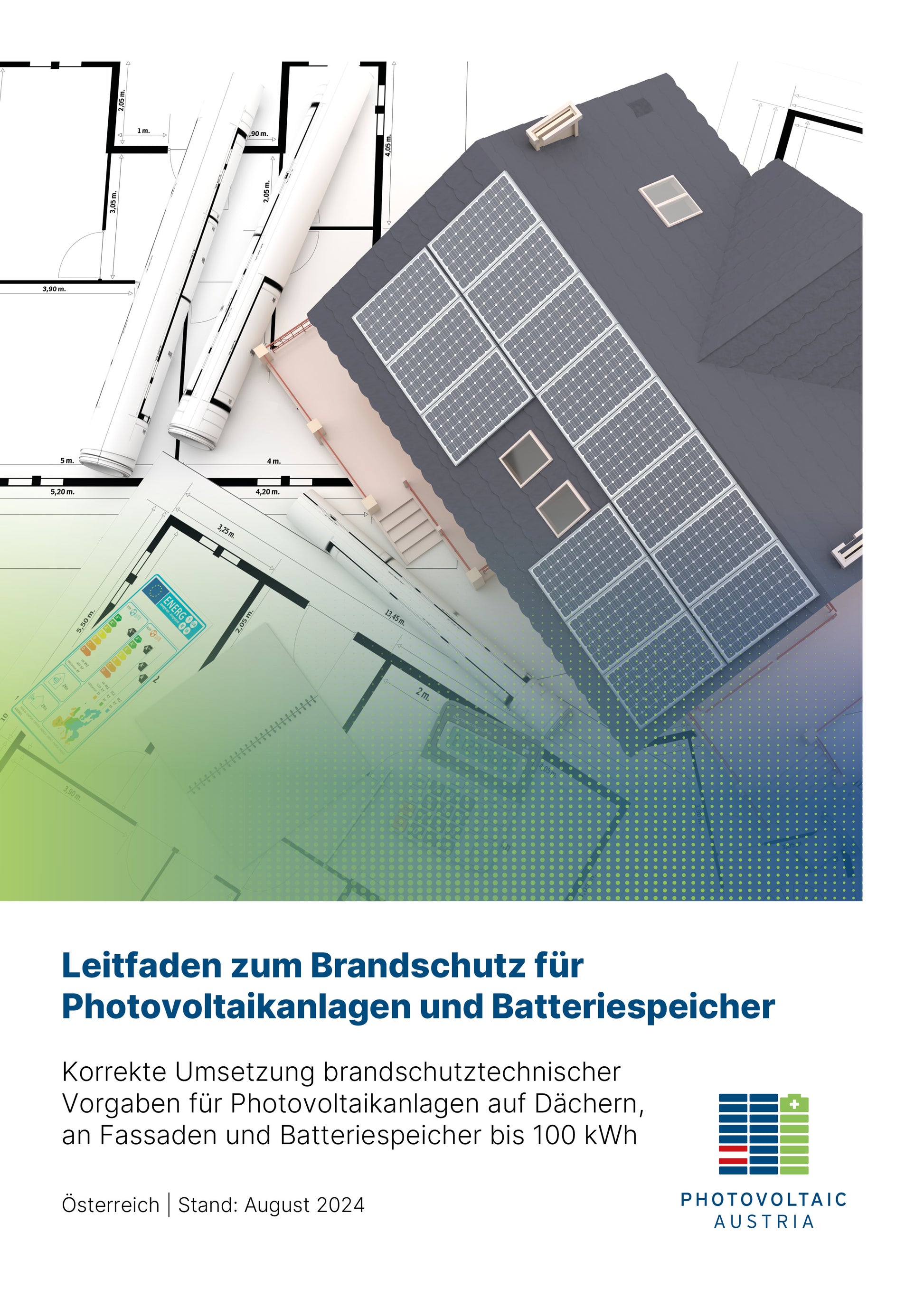 Der „Leitfaden zum Brandschutz für Photovoltaikanlagen und Batteriespeicher“ des Branchenverbands Photovoltaic Austria fasst die wichtigsten brandschutztechnischen Vorgaben zusammen und gibt Präventionstipps, um Photovoltaik-Brände zu vermeiden. Die korrekte Umsetzung brandschutztechnischer Vorgaben für Photovoltaikanlagen auf Dächern, an Fassaden und Batteriespeicher bis 100 kWh wird gezeigt. Behandelt werden u. a. die OIB-Richtlinien 2, 2.1, 2.3, die OVE-Richtlinie R 11 sowie R 20. Der Leitfaden richtet sich sowohl an Errichter*innen, Betreiber*innen als auch an Sachverständige.