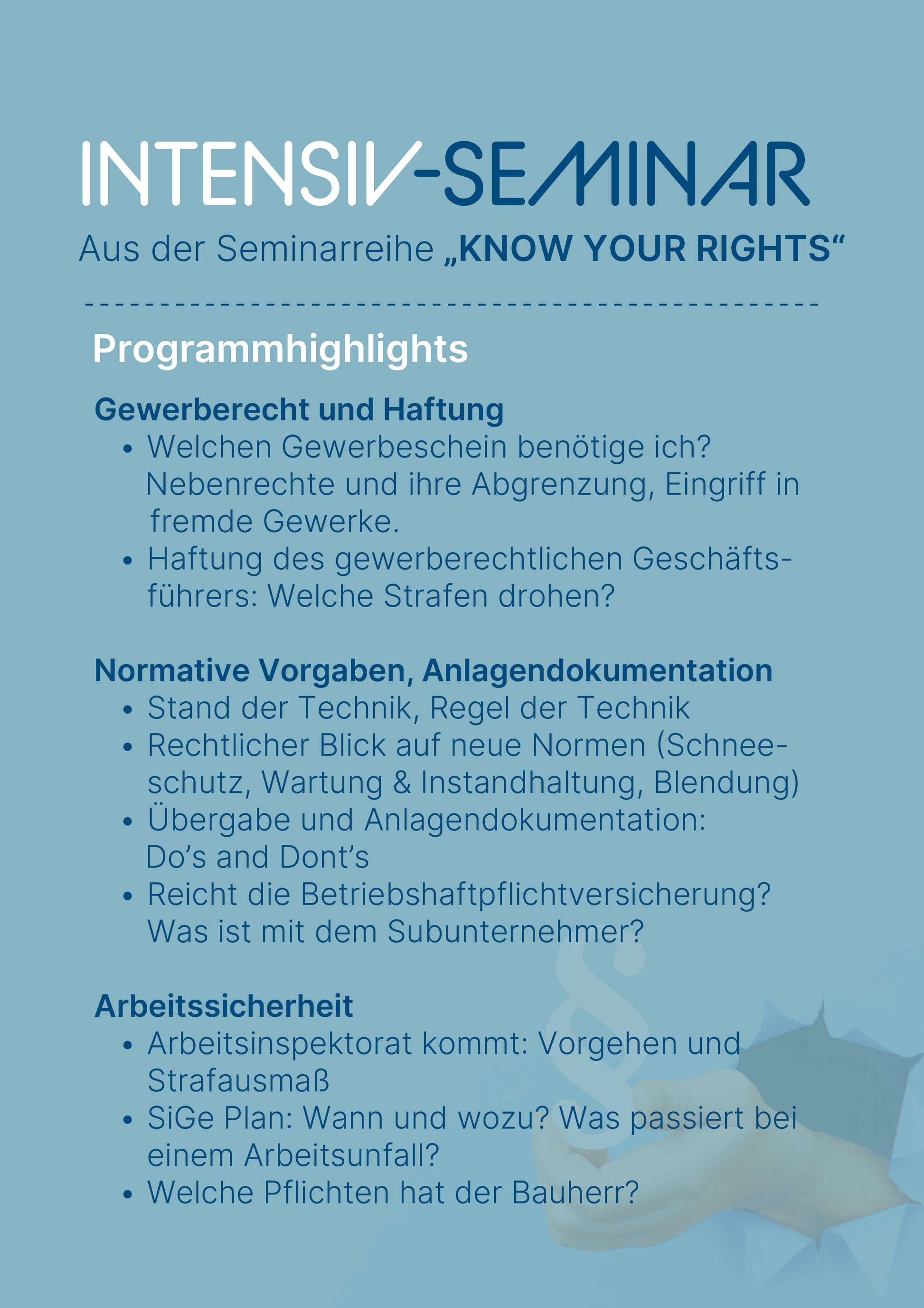 Intensiv-Seminar: Rechtliche Pflichten im Projektablauf: Gewerberecht, Normen und Arbeitssicherheit 10.06.2026 (ohne Mitgliedschaft)